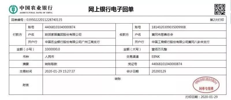 1月29日,欧派家居集团驰援疫情较为严重的黄冈,向黄冈市慈善总会捐助200万元人民币,款项将作为疫情防控专款使用。