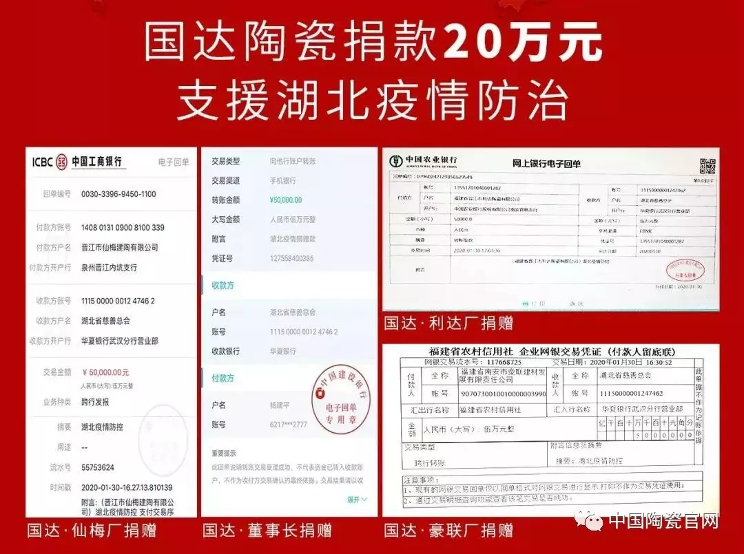 1月30日,国达陶瓷向湖北省慈善总会捐款20万元,用于支援“新冠肺炎”防控工作,为国家抗击疫情战役贡献自己的力量!同时,国达陶瓷董事长杨建平先生以个人名义捐款5万元,并在杨董事长带领与授意下,国达陶瓷仙梅生产基地、豪联生产基地、利达生产基地也分别向湖北省慈善总会捐款5万元。