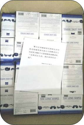 湖南省眼镜商会执行会长单位长沙宏泰眼镜商贸有限公司刘清奇总经理作为蔡司光学湖南省代理商捐赠给武汉人民医院7000片无菌酒精消毒擦试纸,支援武汉抗疫工作。