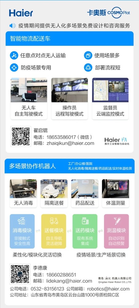 卡奥斯COSMOPlat智能物流配送车、多场景协作机器人等产品可满足企业在疫情期间不同场景下的无接触性需求及协同服务。