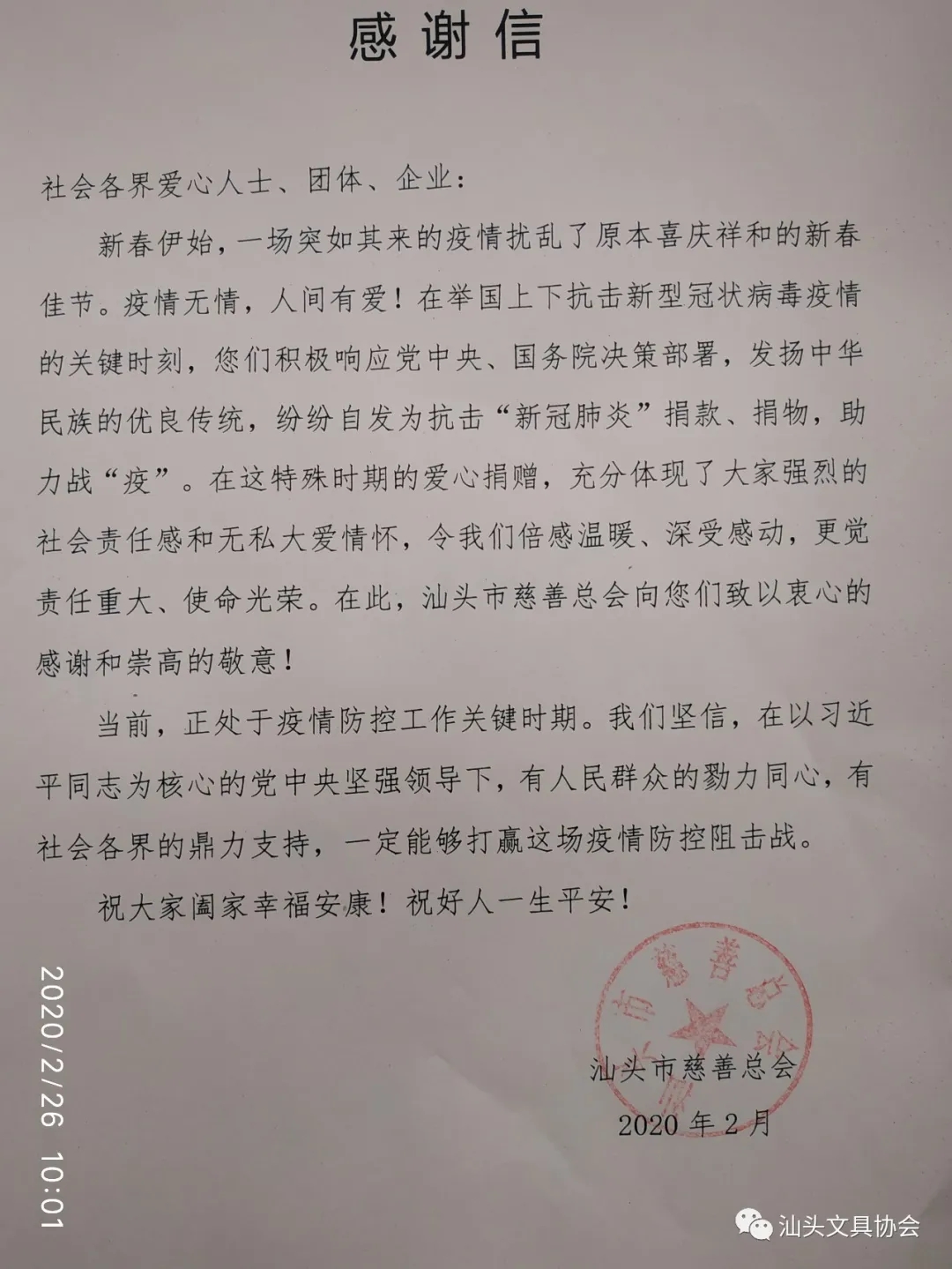 为深入贯彻习近平总书记的重要指示和李克强总理的重要批示精神,认真落实党中央、国务院和省委、省政府,以及市委、市政府的工作部署,更广泛地动员社会慈善力量,依法有序支持疫情防控工作,汕头文具协会就本次全国性新冠肺炎疫情,本着发挥协会优势,动员协会力量,汇集会员爱心,发挥一方有难八方支援的优良传统精神。汕头文具协会向汕头市慈善总会捐款人民币3万元作为购买疫情防控物资所用,协助党和政府遏制疫情蔓延势头尽协会绵薄之力。