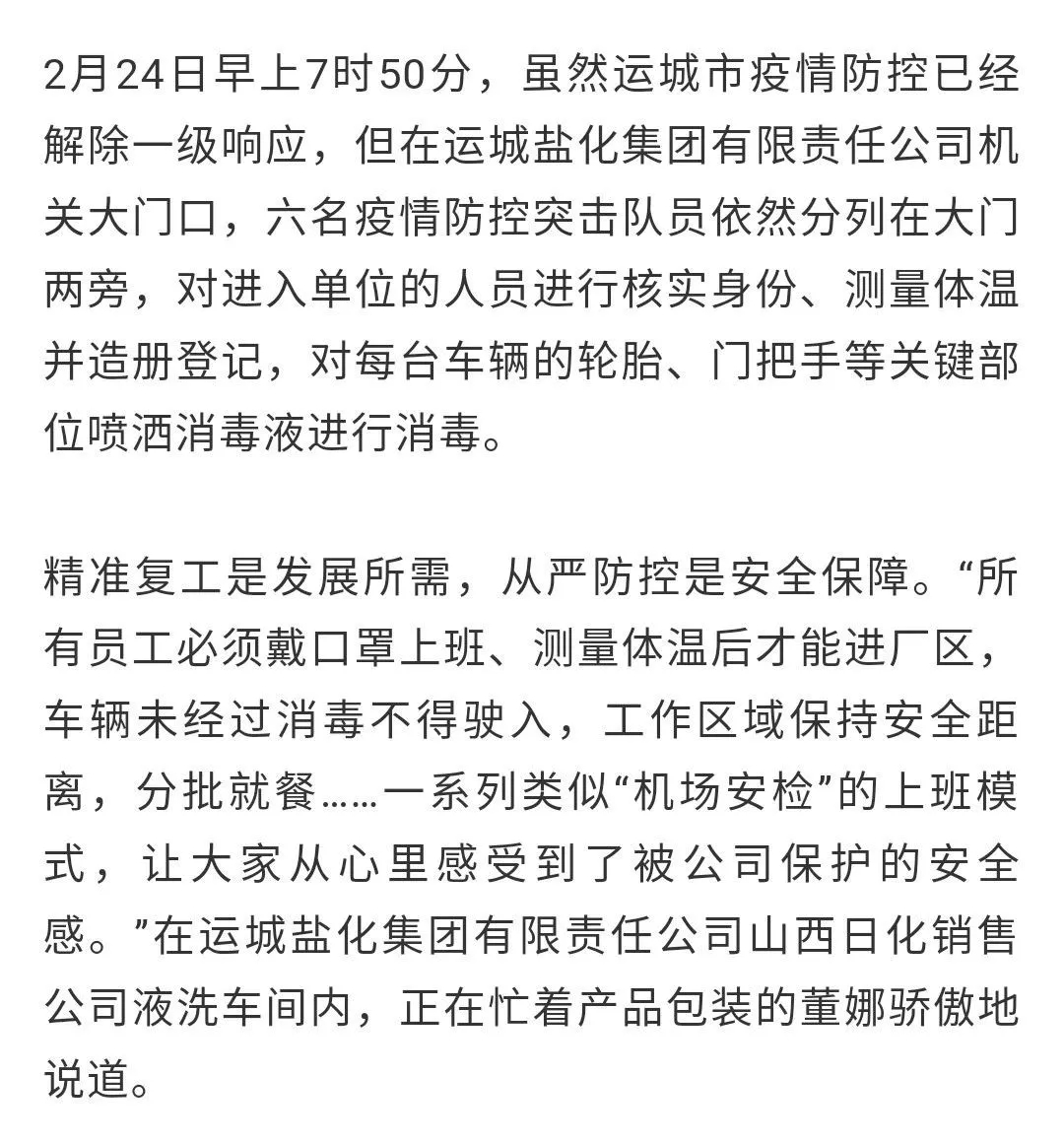 一边严防死守,狠抓疫情防控;一边复产复工,强化供应保障。运城盐化集团有限责任公司坚定信心、同舟共济、科学防治、精准施策,为打赢疫情防控阻击战提供有力保障。