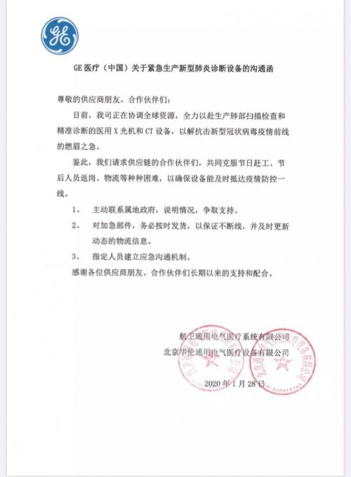 航卫通用电气医疗系统有限公司是震旦多年统购客户,这次GE医疗协调全球资源,全力以赴生产肺部扫描相关设备,以支持抗击新型冠状病毒疫情前线。震旦家具作为医疗家具产品专业品牌,有责任和义务为抗击疫情贡献一份力!