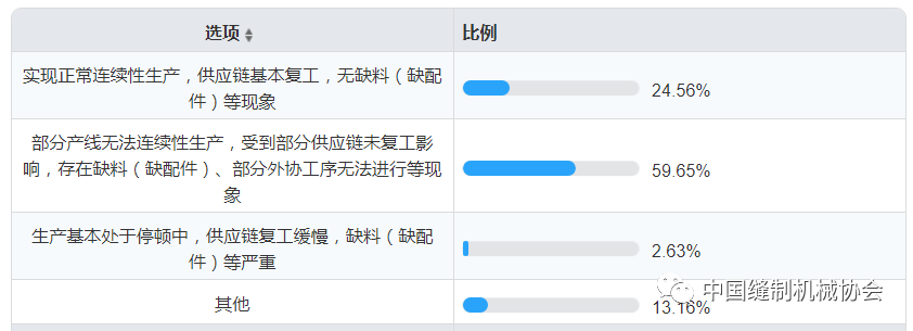 调研统计显示(图5),当前仍有59.65%的企业由于受人员未完全返岗、供应链企业复工滞后等影响,存在部分原料、配件供应不及时,导致企业部分产线无法实现连续性生产,造成部分企业存在复工却未能复产等现象。如,行业电控、挑线杆等重要零部件,受重点企业缺工和产能不足等影响,目前仍处于供给不足缺货状态;铸造、热处理、电镀、发黑等外协企业大都设在远离市区的乡镇郊区,受疫情控制、人员返岗、交通限制等影响,复工更为缓慢,产能明显不足,在一定程度上影响了零部件企业的正常生产和供给能力。