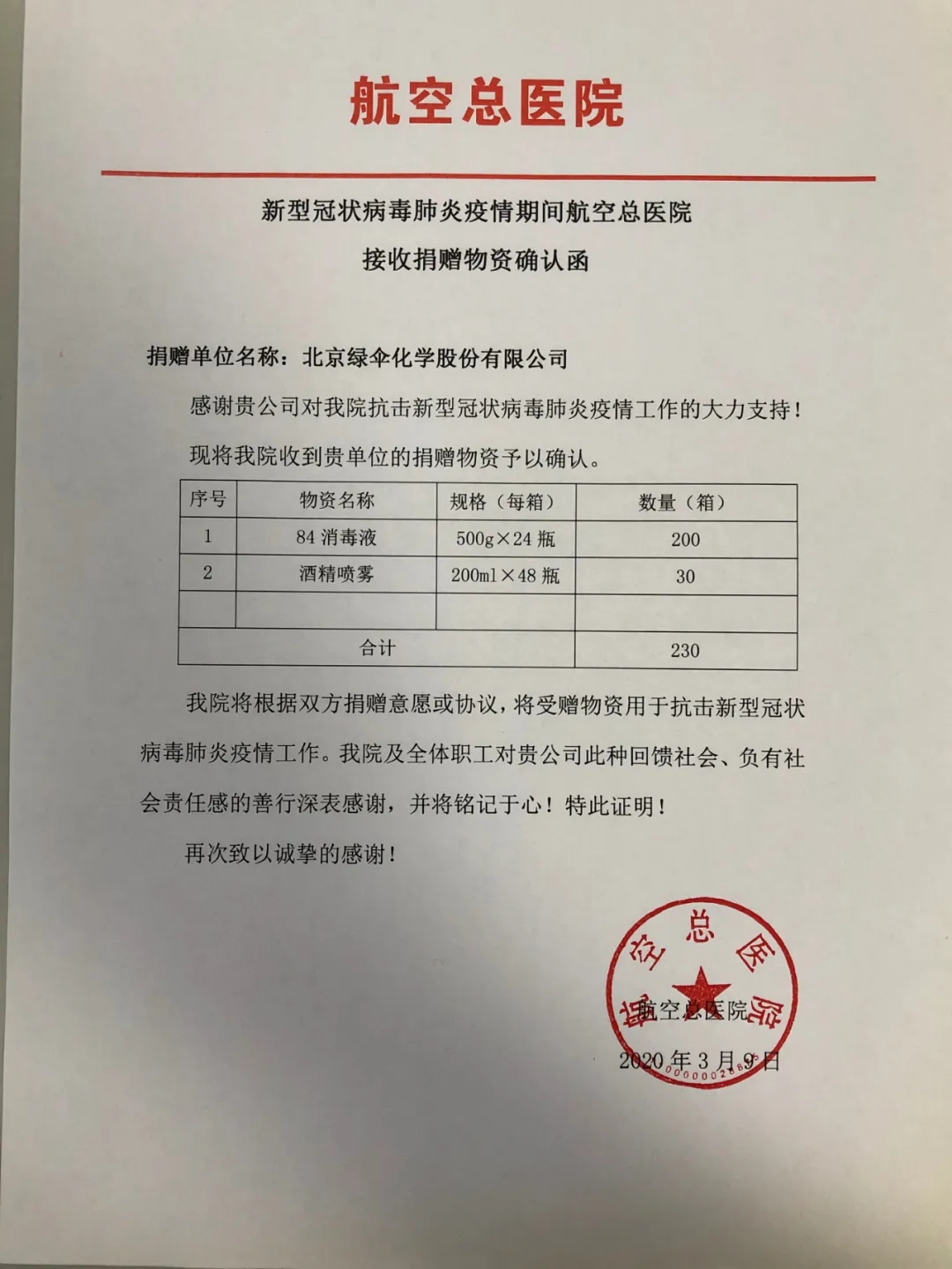 △航空总医院给绿伞的捐赠证明并表示感谢