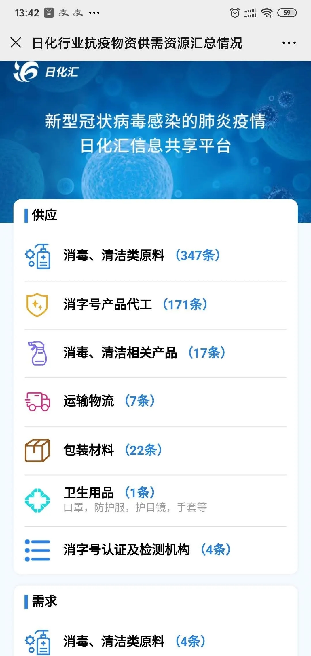 供需平台涵盖消毒与清洁类原料、消字号产品代工、消毒、清洁相关产品、运输物流、包装材料、卫生用品等企业信息,为日化行业、企业、参与者赋能,打破信息孤岛,提升日化及消杀类防疫物质生产的供应速度。