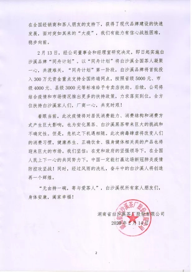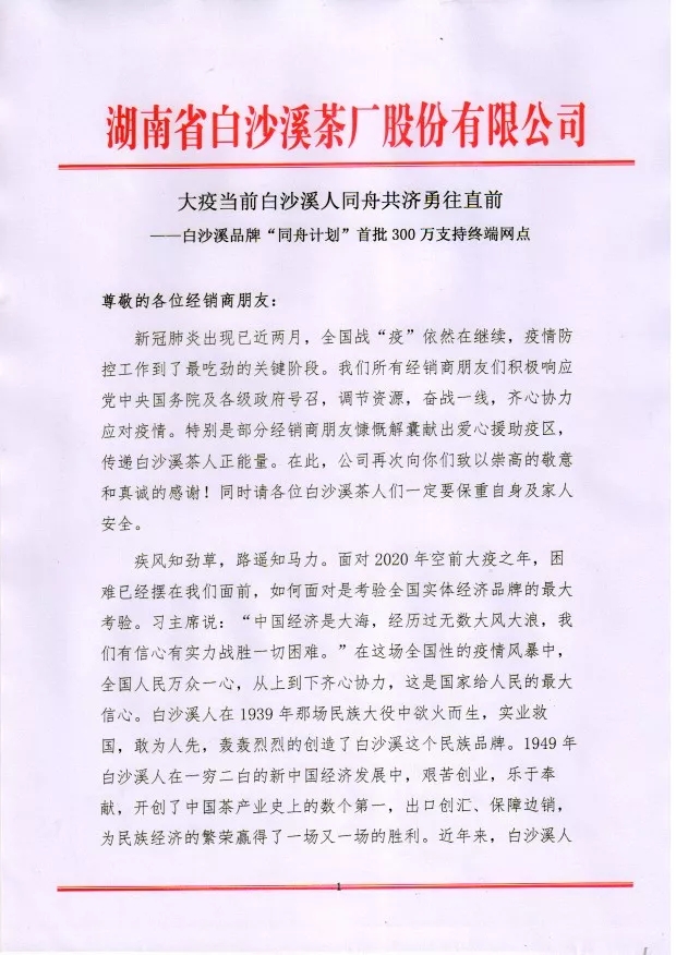 白沙溪品牌“同舟计划”首批300万支持终端网点