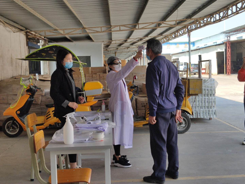 1.体温测量:早上7点20分,公司组织的防控工作人员全部就位。门卫设立测温点,安排专人为来岗员工测量体温,并在体温监测日报上留好记录;对出入车辆进行分流、引导,确保人员测温、登记无遗漏。经测量,体温无异常方可进入。若发现员工出现体温超过37.2度、有干咳、乏力、逐渐呼吸困难等症状,立即安排就医。复工当天,到岗员工的体温无异常。体温测量结果由各单位汇总确认后上报公司办公室。