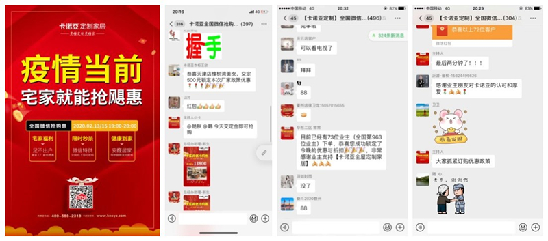 同时,卡诺亚积极探索未来竞争新模式。2月13日/15日,筹备半个月的全国微信抢购惠爆破活动线上落地,众志成城、攻城略地,在营销和运营推广团队的积极动员、强力执行之下,全国各战区微信群爆满,客户下单不断,销售业绩突破新高,实现了卡诺亚2020年开年的首战告捷!