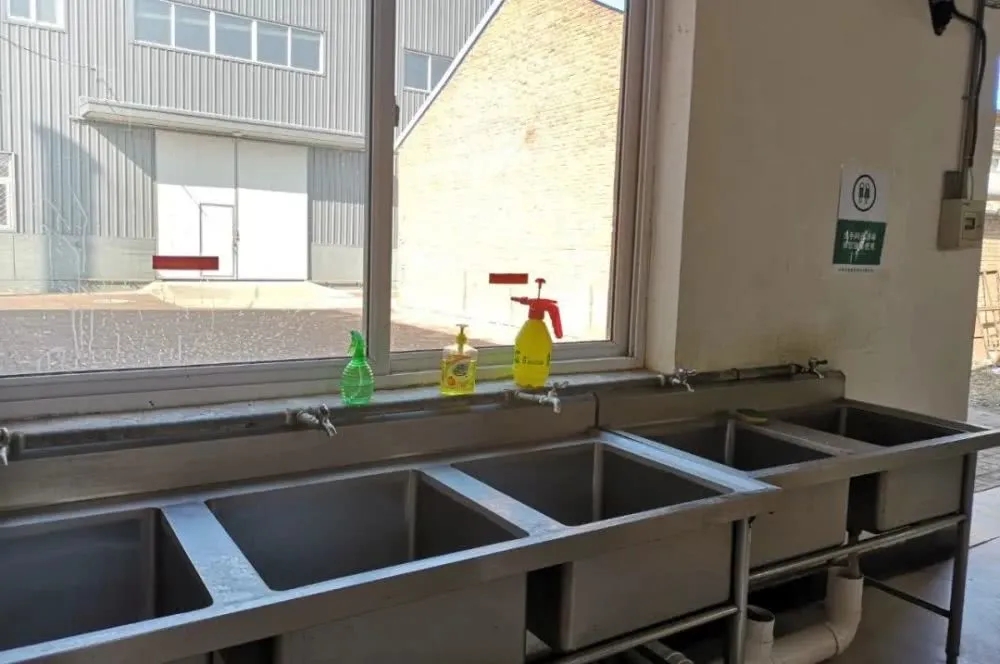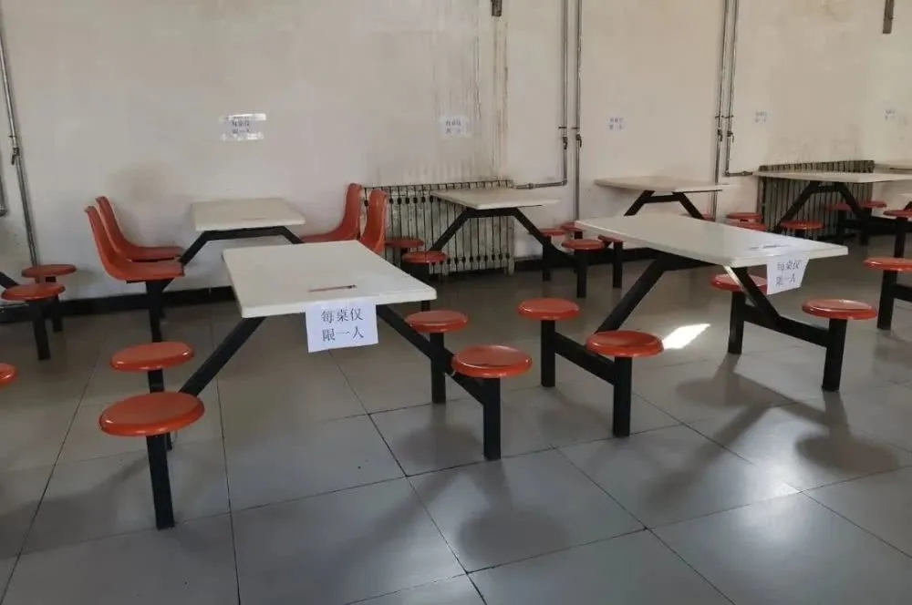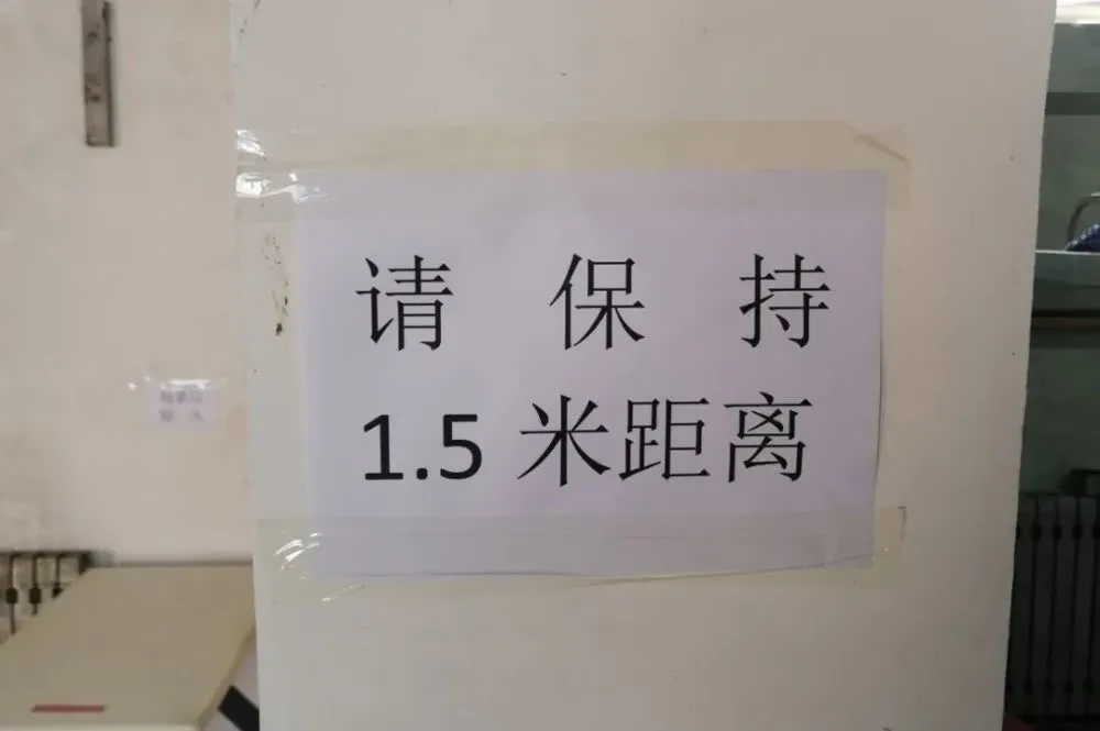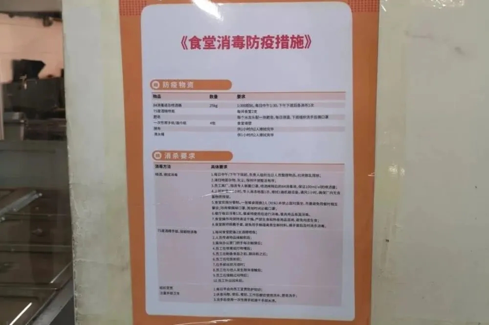 在职工食堂,地面设置的间隔1.5米的标示线十分醒目,每个餐桌粘贴了“每桌仅限1人”标识,时刻提醒着用餐人员避免密集接触,操作间显著位置张贴了《食堂消毒防疫措施》,清洗池旁摆放的清洁用品一应俱全。