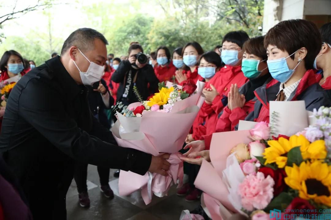 慰问活动现场,刘苹主席赞扬每位医护人员都是新时代最可爱的人、最美丽的天使、最无畏的战士!工作人员献上了鲜花、赠送了暖心包。古井贡酒企业代表还给每位援鄂医务人员带来了“向您致敬 为胜利干杯”年份原浆古20定制酒,表达对英雄的诚挚祝福和崇高敬意。