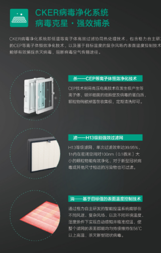 CKER病毒净化系统包括格力自主研发的CEP等离子体恒效净化技术、H13级别强效过滤网和基于目标温度的复杂风场内表面温度控制技术,这一套杀病毒“组合拳”就是针对新冠病毒的特性展开研究的。