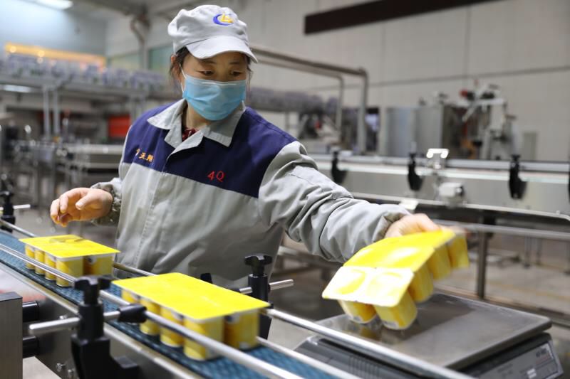 3月3日,位于丰县开发区的江苏君乐宝乳业有限公司,工人们在奶制品生产包装流水线上紧张作业。目前该公司已开启18条生产线,复工率达100%,产品日产量达200吨。