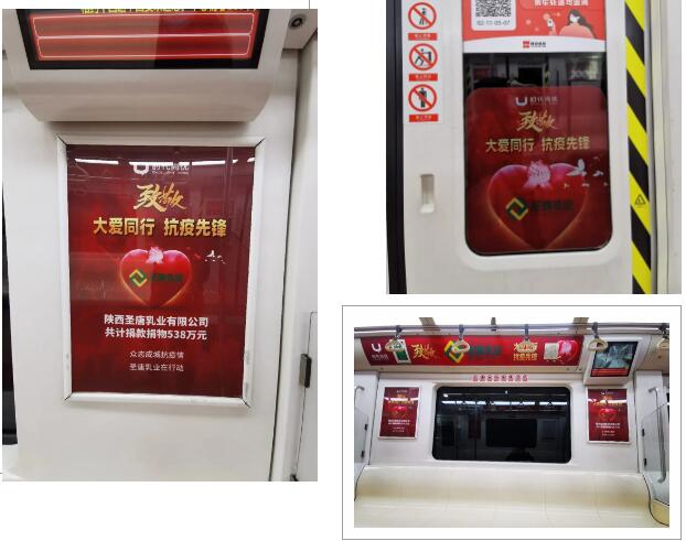 近日,由抗“疫”先锋陕西圣唐乳业有限公司携手西安时代尚优传媒等单位在西安地铁二号线举行的公益展播宣传活动已经正式启动。走进西安地铁2号线列车车厢,车门、车体两侧、车内灯箱、车内侧顶等位置,到处都是圣唐乳业公益宣传牌,“致敬 大爱同行,抗疫先锋”几个大字鲜艳夺目,满目红色的公益宣传牌,温暖着每一个乘客的行程,鼓励着每个人的抗“疫”决心,成为这个春天里的一道独特的风景线。