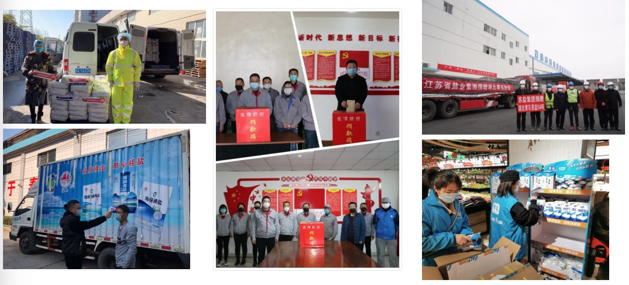 中国盐业集团有限公司在疫情爆发之初向湖北捐赠700万元用于抗击疫情;汇泰控股集团股份有限公司先后向所在地政府卫生、社区等机构捐款总计603万元,捐赠医疗设备(价值100万元),并承诺“疫情不退,汇泰不撤”;湖南省轻工盐业集团有限公司定向捐款500万元,捐赠物资136万元,全力支持湖南省抗疫;此外,成都云图控股股份有限公司、内蒙古盐业公司、江西省盐业集团有限公司、广西盐业集团有限公司、山东大地盐化集团公司等各地多家盐业企业都自发地向医疗机构、社会相关服务部门捐款助战。还有多家盐业企业积极捐赠隔离服、医用口罩、消毒液、医用酒精、弥雾机、消毒用盐等医疗物资,以实际行动诠释了中国盐行业高度的社会责任感和时代使命感。