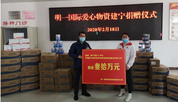 2月18日——明一国际再次捐出第三批价值三十余万元的益生菌和奶粉,抵达福建三明市建宁县卫健局,并在疫情期间,企业会全力支持防疫工作,希望能为社会尽一点绵薄之力。