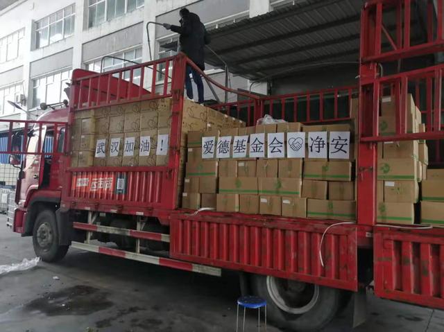 1月25日下午,爱德基金会向上海净安化工科技有限公司提出紧急物资需求,公司迅速部署。浙江长兴工厂紧急调配,于1月26日下午确保所有支援疫区的物资到位。1月27日一早,重达10吨、价值超40万元、超过15000件消毒液、免水洗洗手液和抑菌洗手液装车完毕,挂着“武汉加油”的物资车辆前往疫区。