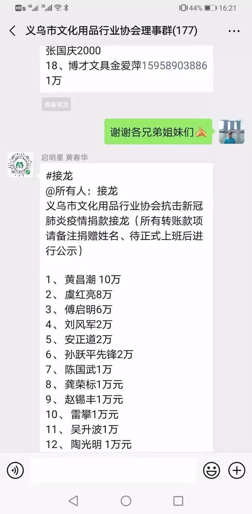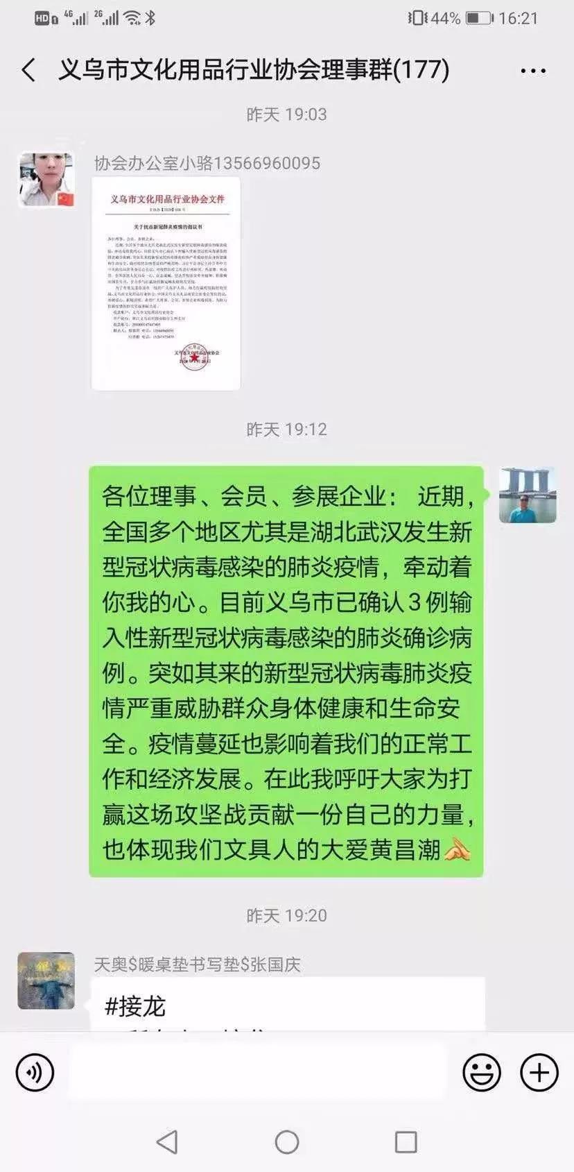 “@所有人:义乌市文化用品行业协会抗击新型冠状病毒肺炎疫情捐款接龙!”——义乌市文化用品工作人员在微信群发出倡议。