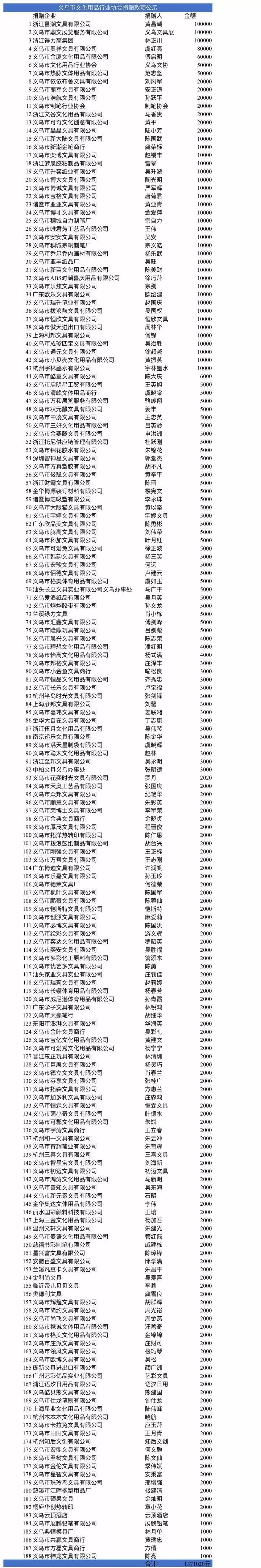 1月28日,经协会微信会长群办公会议商量,决定发起捐款助力抗击新型肺炎疫情的行动,当晚19:00,捐款正式开始。协会会长黄昌潮积极动员,呼吁协会理事,义乌文具礼品展览会参展商爱心捐款行动。经过一天努力已筹集善款137.102万元人民币,协会决定把这笔款项统一捐给义乌市红十字会,并全力支持抗击新型冠状病毒感染的肺炎疫情防控工作。