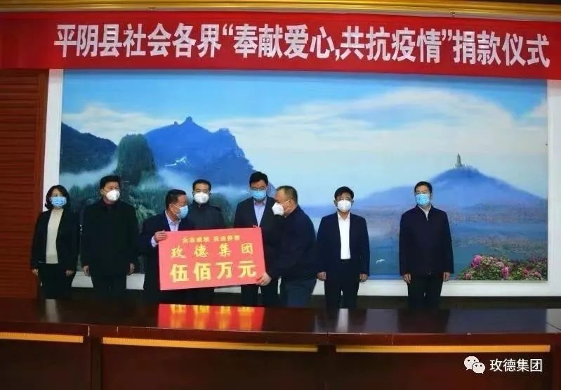 1月29日,为支持新型冠状病毒疫情防控工作,玫德集团捐赠500万元现金(其中向武汉慈善总会定向捐赠200万元, 向平阴县慈善总会捐赠300万元)抗击疫情。