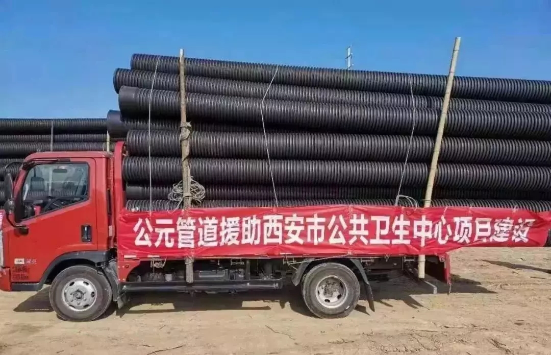 2月2日,永高股份有限公司得知西安市新型冠状病毒感染的肺炎疫情防控指挥部建设的西安公共卫生服务中心工程需要相关管道产品的消息后,及时协调西南销售服务中心,于2月3日把第一批援捐的800米HDPE双壁波纹管送到工程工地。