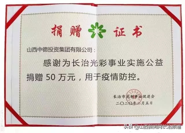 继为医院捐献发热门诊隔离病区门窗材料,2月3日,中德集团总部、四川公司再次通过长治市光彩事业促进会和成都市新津县红十字会捐赠资金50万元,用于抗击武汉新型冠状病毒疫情防控。