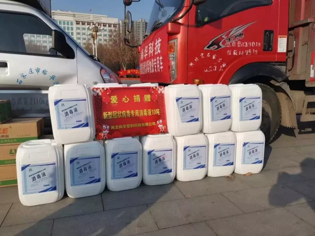 河北尚华塑料科技有限公司积极驰援石家庄元氏县的新型冠状病毒感染的肺炎疫情抗击工作,向元氏县政府捐赠新型冠状病毒专用消毒液10吨,由县政府统一分配,并安排专车负责消毒液的运送工作。