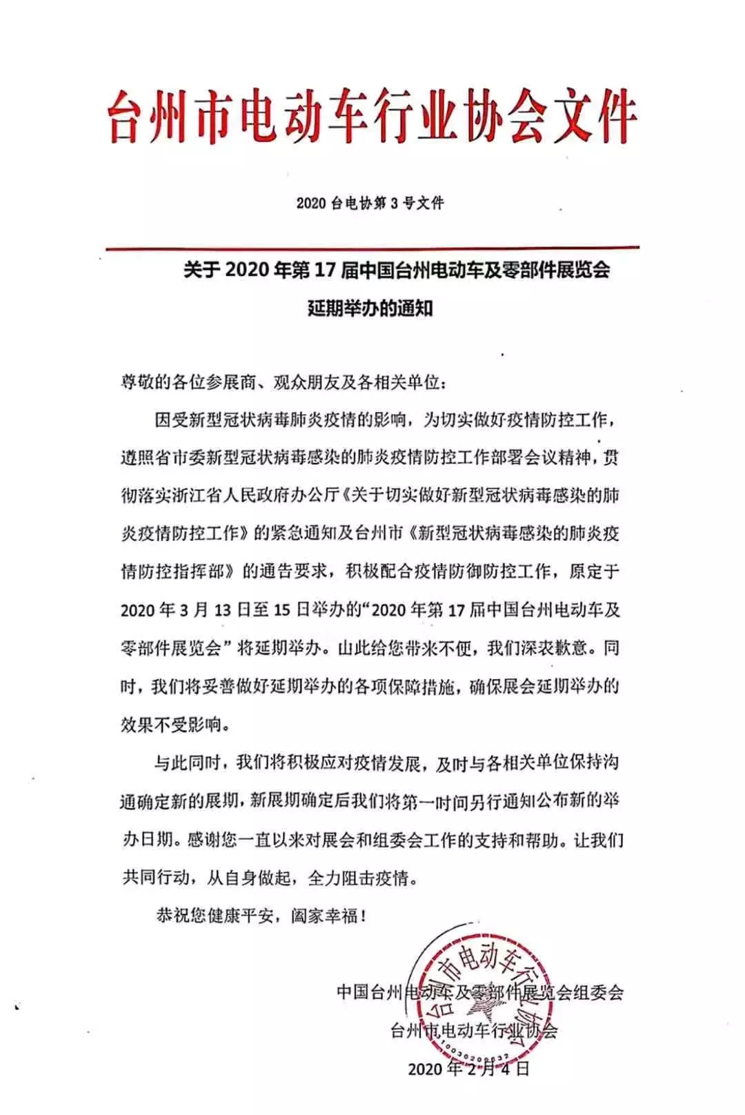 受疫情影响,继原定2月28日-3月1日举办的济南新能源汽车电动车展会发布通知延期举办后,原定于3月13日-15日举办的台州展也于2月4日正式宣布将延期举办,新展期将另行通知。