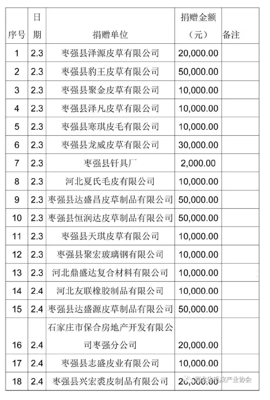 截止2020年2月7日,皮革行业捐款捐物者,献出无私爱心者,远远不止这些,不管我们知道不知道,都为他们点赞,向他们致敬!
