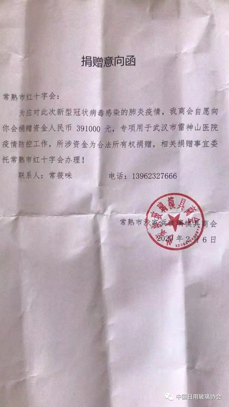疫情阻断不了温暖 日玻人在行动!(六) 在全国上下齐心协力,努力抗击疫情的关键时期,我们日玻人一直紧密的关注新冠肺炎的防控工作,在这场捍卫生命的战斗中,不分你我,为抗疫凝聚力量: 2月6日下午,沙家浜玻璃模具商会常务副秘书长常筱咪专程将39.1万元捐款送到常熟市红十字会,专项用于武汉雷神山医院疫情防控工作,这是常熟红十字会目前收到的最大的一笔企业界专项捐款。 元月31号,商会会长赵义元先生和常务副会长兼秘书长马建华先生得知疫情严重,湖北告急、武汉告急,特召集商会相关人员组织讨论,一致认为灾区有难,我们模具人应该承担起相应的社会责任,于是指令常筱咪在成员企业中发起捐助倡仪,倡议发出后,常熟市精工模具制造有限公司、常熟市建华模具科技股份有限公司等四十多家企业纷纷响应,慷慨解囊,短短两天时间就筹到近四十万元善款!大家用实际行动诠释了沙家浜模具人的红色情怀!!活动结束后,赵会长、马副会长又郑重嘱咐要把此款妥善交接。 “世界最美是玻璃,模具成就玻璃美”,扎根在沙家浜这片红色土地上的模具人,心中永远流淌着沸腾的大爱!我们相信,在党中央的正确领导下,终将打胜这场疫情防控歼灭战,中华民族完胜!