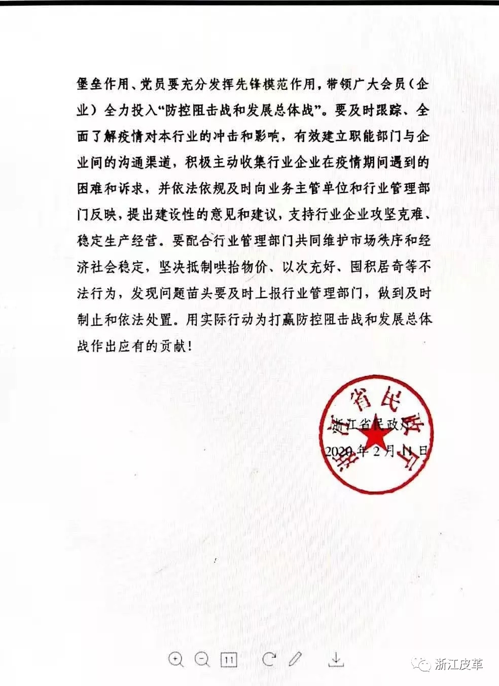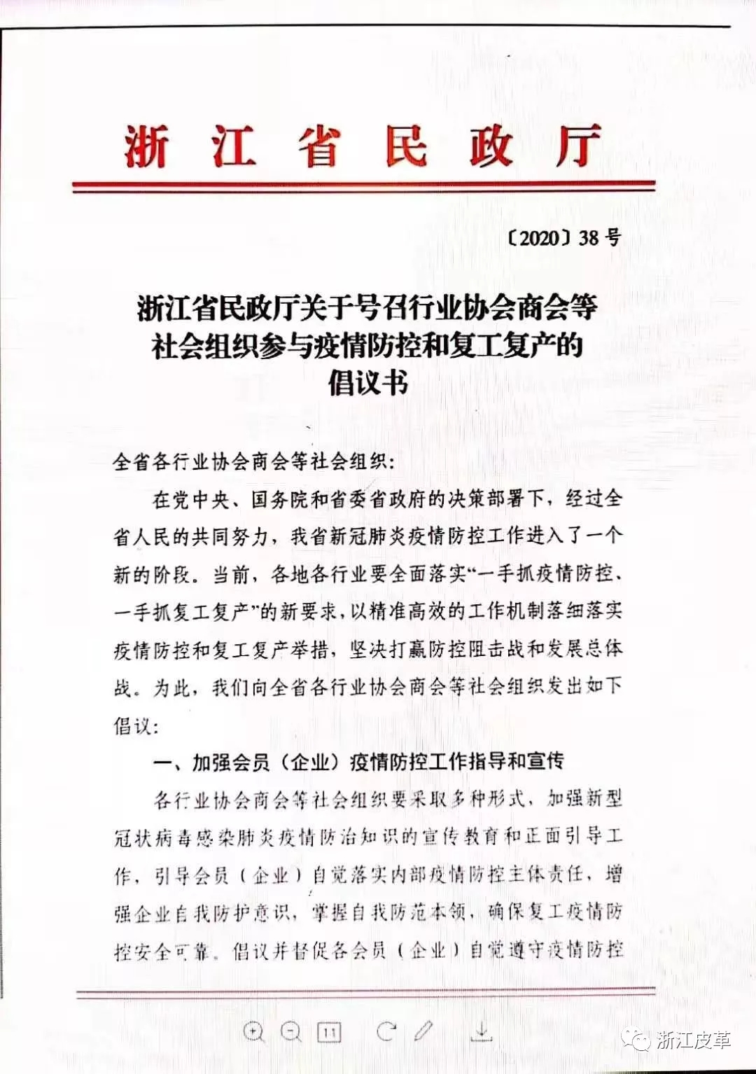 浙江省皮革行业协会要求全省各地地方皮革行业协会商会积极响应浙江省民政厅号召行业协会商会等社会组织参与疫情防控和复工复产倡议书,落实各项倡议举措,在各地疫情防控和复工复产两手抓的关键时刻,按照当地党委和政府有关规定,指导督促和帮助企业按照规定做好复工复产、疫情防控和安全生产工作。发挥桥梁作用,积极与政府沟通,帮助企业解决困难。