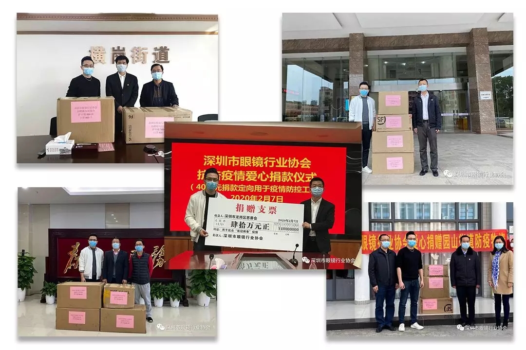 自大年三十以来,在深圳市眼镜行业协会会长陈秋鹏的倡议带领下,协会开始面向深圳眼镜行业各企业筹集捐助疫区的物资和善款,并将筹得的善款物资及时送到给深圳各级抗疫一线人员手中。截止2月6日,深圳市眼镜行业协会共筹得资金412359元,护目镜9100副,口罩3000副。这批款项物资将用于龙岗区政协、龙岗区产服集团、横岗街道办、园山街道办、龙城街道办、宝龙街道办等单位的防疫工作。