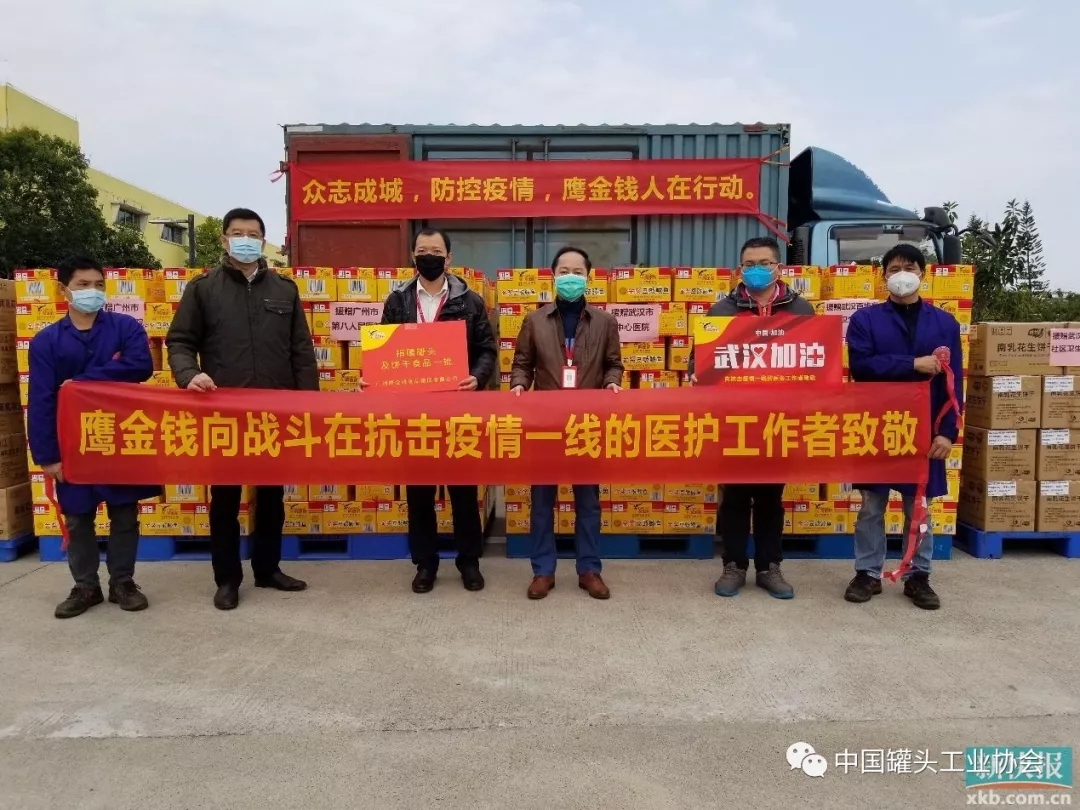 2月17日,广州鹰金钱食品集团有限公司分别向武汉市中心医院、武汉市江岸区百步亭花园社区卫生服务中心、广州市第八人民医院定向捐赠罐头及饼干食品物资一批,为在疫情防控一线的医务人员提供援助及慰问。广州鹰金钱食品集团有限公司身为国有企业,自疫情发生以来,在公司党委、工会的积极指导和部署下,市场营销部门主动联系相关志愿组织及政府机构。及时跟进疫情物资支援工作。协调生产及储运等部门,提前复工,加班加点生产支援物资,时刻准备响应社会的需求。城可封,情不可封。鹰金钱相关负责人表示,罐头高温杀菌,真空锁鲜,曾是战争中战士营养来源的罐头。面对这场无硝烟的防疫战争,罐头正好可以为前方一线抗疫医护人员解决日常营养补充所需,抢得更多时间返岗待命。
