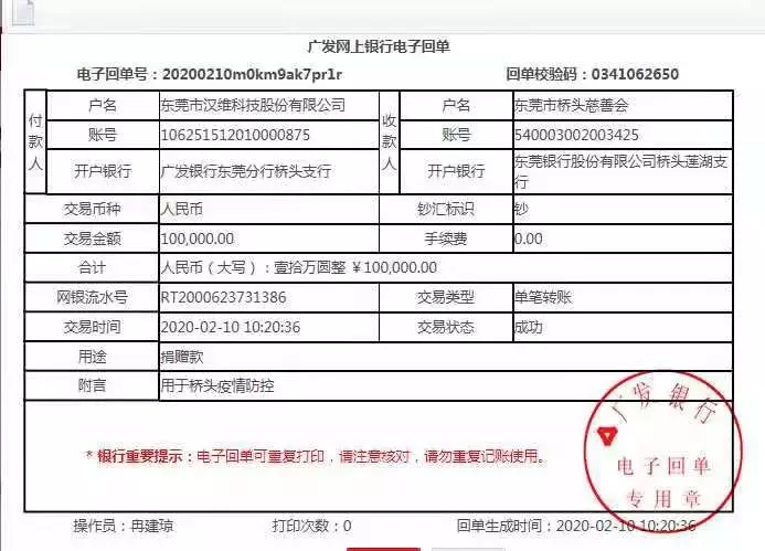 2月10日,东莞市汉雄维科技股份有限公司向东莞市桥头慈善会捐款10万元,用于桥头镇疫情防控工作.