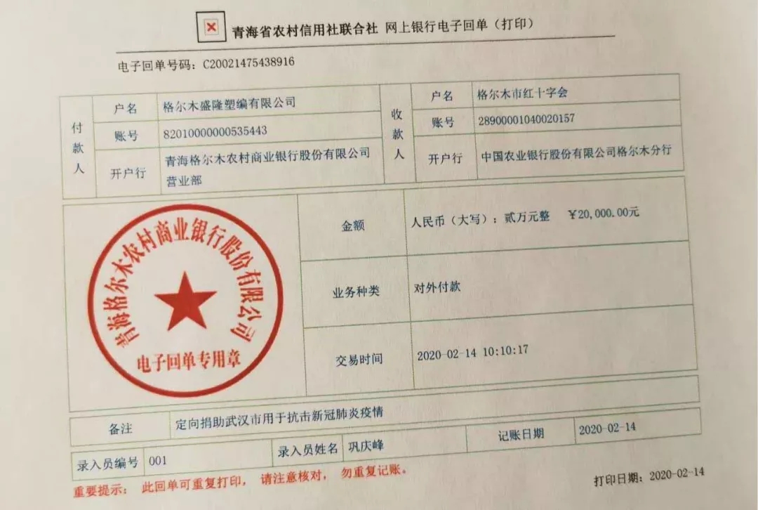 2月14日历,格尔木盛隆塑编有限公司向青海省格尔木市红十字会捐款2万元,定向捐助武汉市用于抗击新冠肺炎疫情。