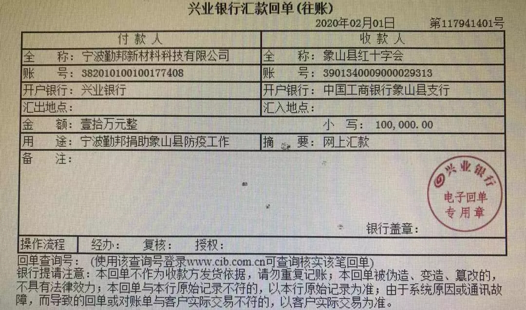 2月1日,宁波勤邦新材料科技有限公司向象山县红十字会捐款1万元,用于象山县防疫工作.