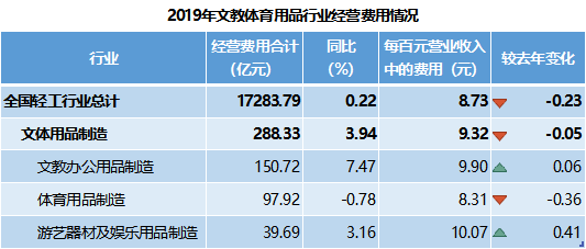 2019年,全国文教办公用品行业累计经营费用(营业费用、管理费用、财务费用之和)合计288.33亿元,同比增长3.94%,比营业收入增速低0.54个百分点;每百元营业收入中的费用9.32元,较上年小幅下降0.05元,但高于
