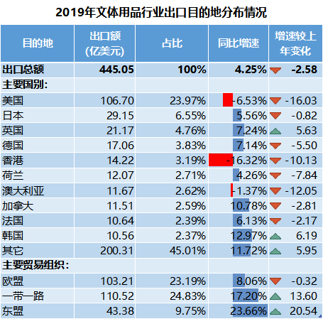 2019年,全国文教体育用品制造业累计完成出口额445.05亿美元,同比增长4.25%,增速比上年下降2.58个百分点,比同期轻工业出口增速低1.14个百分点。