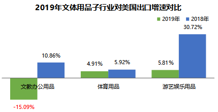 2019年,对美出口下降,占比缩小。美国是我国文体用品第一大出口市场,全年对美国累计出口额106.70亿美元,占对所有国家出口总额的23.97%,占比较2018年下降2.77个百分点;行业对美国出口累计同比下降6.53%,增速较上年下降16.03个百分点。3个子行业对美出口比重见下图。