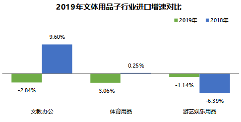 2019年,全国文教体育用品制造业累计完成进口额26.58亿美元,同比下降2.88%,增速比上年下降9.49个百分点,比同期轻工业总体进口增速低10.58个百分点。