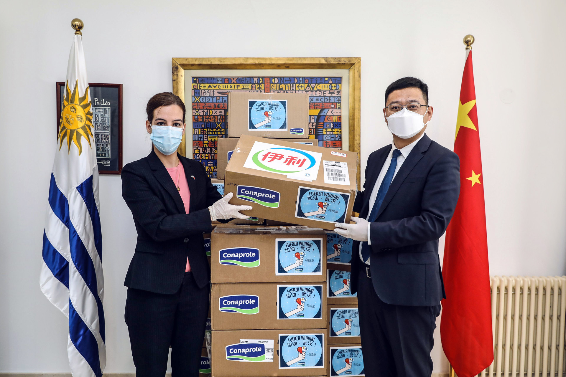 2020年3月5日,乌拉圭驻华大使馆举行了一场简短而特别的捐赠仪式。乌拉圭驻华大使馆临时代办帕乌拉.蕾佩托女士(PaolaRepetto)将5800个口罩转交给伊利集团,用于支持湖北抗击疫情工作。本次捐赠,是伊利携手来自乌拉圭的科拿乳业的抗“疫”行动,由时任乌拉圭外交部副外长阿里尔·贝尔格米诺(Ariel Bergamino)转交给中国驻乌拉圭大使王刚先生,并跨越了2万公里、大半个地球后抵达乌拉圭驻华大使馆,由大使馆正式转交给伊利。 详细