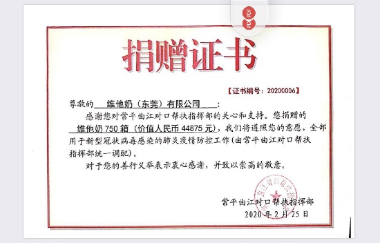 2月25日,维他奶公司将豆奶、红茶等共750件营养产品捐赠给指挥部,并由指挥部统筹分发到一线工作人员。当天,曲江区委常委、副区长、常平曲江对口帮扶指挥部总指挥周大伟代表东莞援派扶贫干部接收了捐赠物资,并对维他奶公司的爱心捐赠表示衷心感谢。 详细