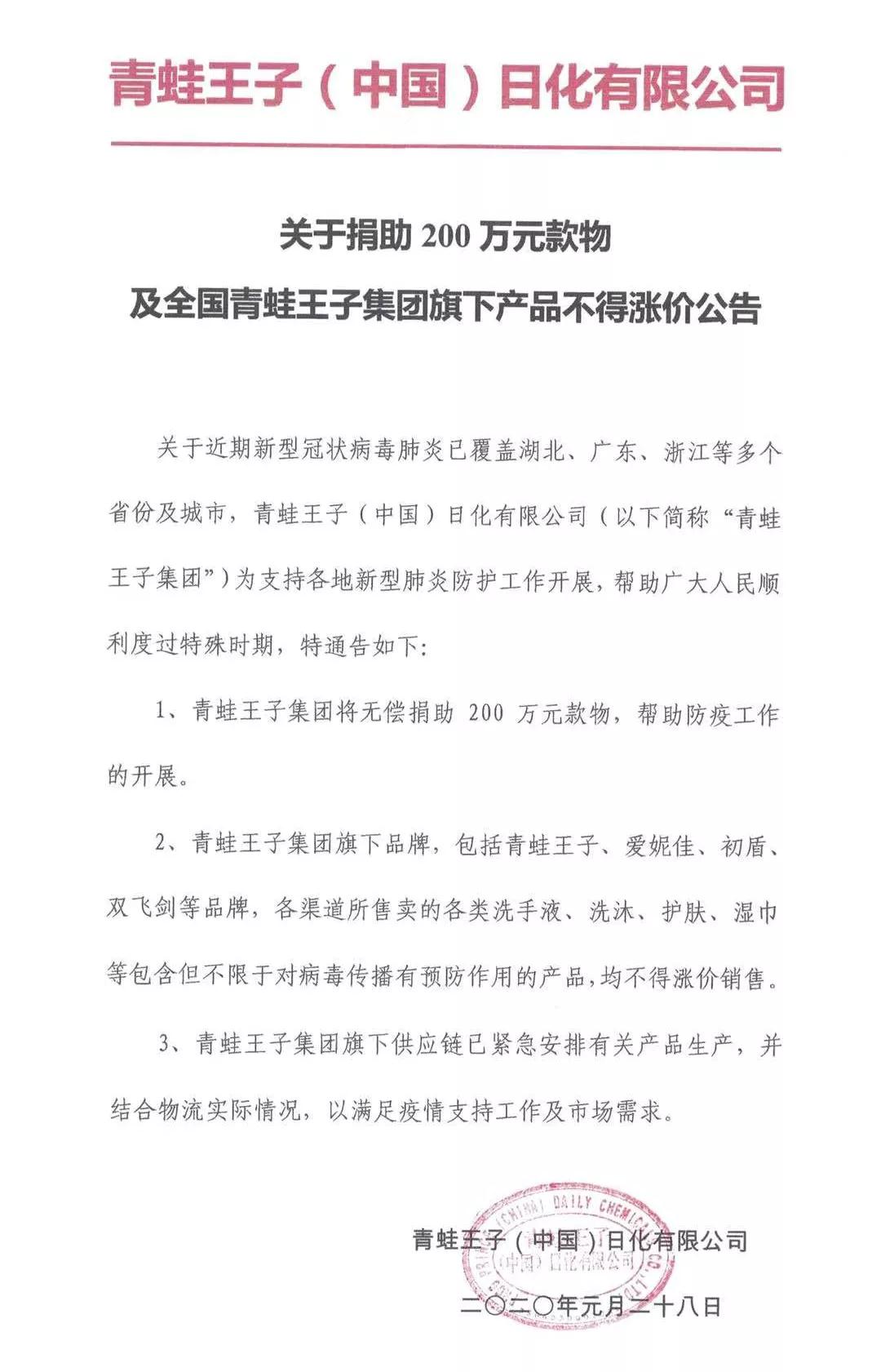 青蛙王子集团关于助力抗击新型冠状病毒疫情的公告