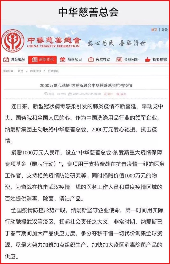 隔离病毒不隔爱!纳爱斯2000万爱心联合中华慈善总会抗击疫情