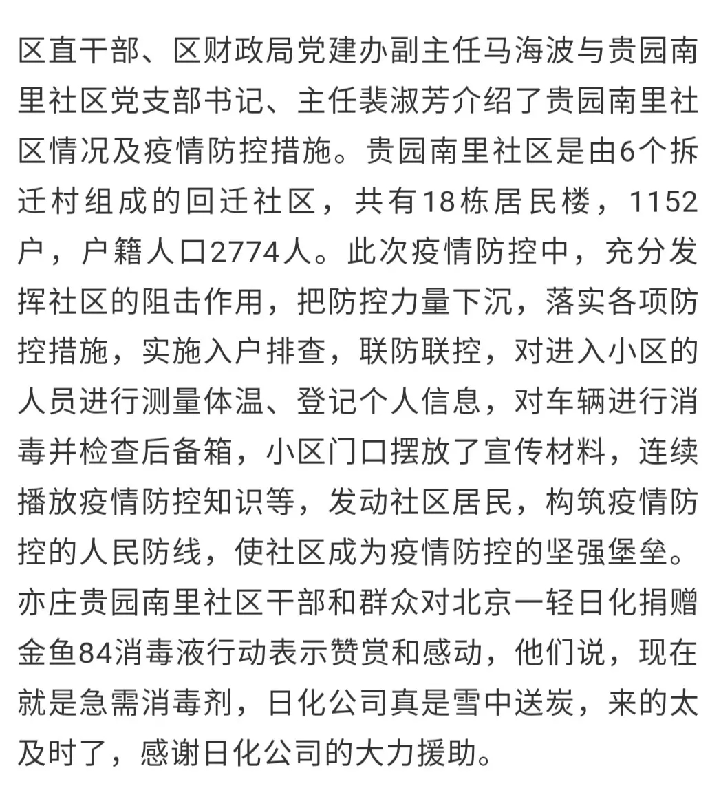 北京一轻日化:"金鱼"消毒液捐赠社区防控一线