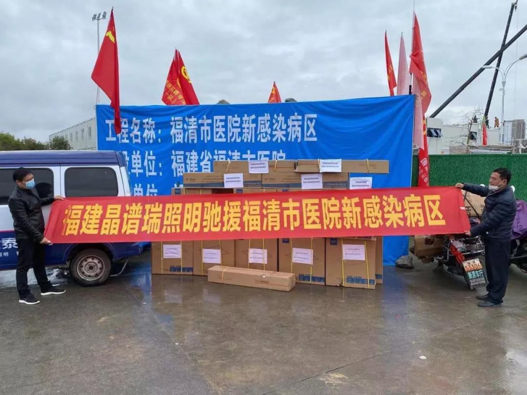2月4日,福建晶谱瑞照明灯饰有限公司驰援福清市医院新感染病区,捐赠240套杀菌消毒设备,为福建福清市修建疫情隔离应急保障中心贡献一份力量。