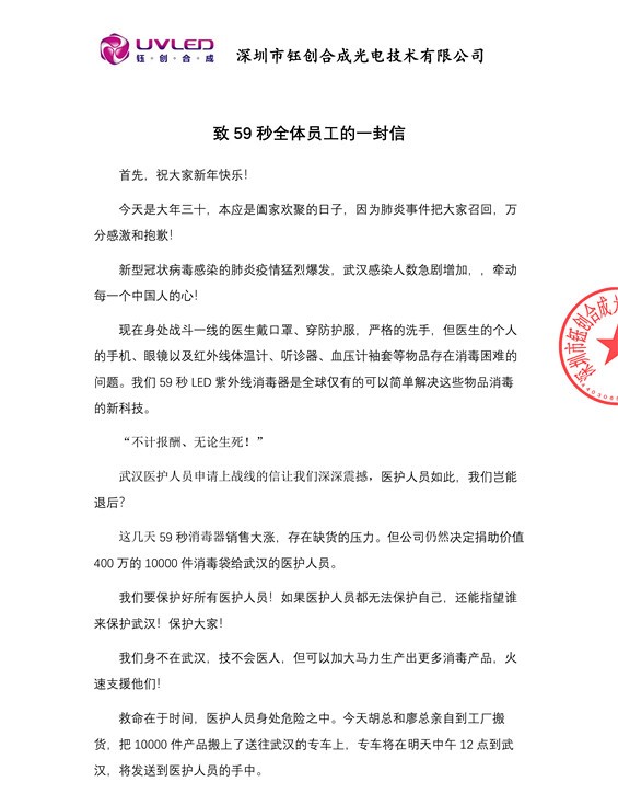 “救命在于时间,医护人员身处危险之中,早一点到达武汉,就能早一点为‘白衣天使’保驾护航”。在这10000套UVC LED紫外线消毒产品顺利抵达武汉的背后,是59秒公司在产品销售大涨,库存不足的情况下,从供不应求的市场上挤出的一批产品。钰创合成副总经理胡惠告诉记者,看到武汉医疗界“不计报酬,不论生死”的请战书后,公司创始人欧阳晨义深深的被感动,他当即在公司发出动员令,决定捐助价值400万的10000套UVC LED紫外线消毒袋给武汉的医护人员。
