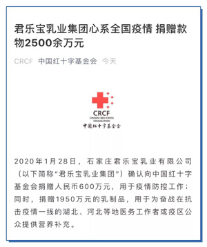 一方面,君乐宝向中国红十字基金会捐款捐物总价值2550多万元,含现金人民币600万元,用于新型肺炎疫情防控工作;同时,捐赠价值1950万元的乳制品,用于为奋战在抗击疫情一线的湖北、河北等地医务工作者和疫区公众提供营养补充。
