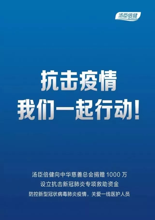 严峻的疫情牵动着亿万中国人的心,1月27日,汤臣倍健股份有限公司通过中华慈善总会捐款1000万元,在其机构内下设“抗击新冠肺炎专项救助资金”,用于抗击新冠肺炎疫情一线医护人员的救助和奖励以及医疗防护物资采购。