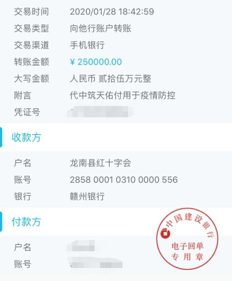 抗击疫情丨 中筑天佑向龙南捐款25万元